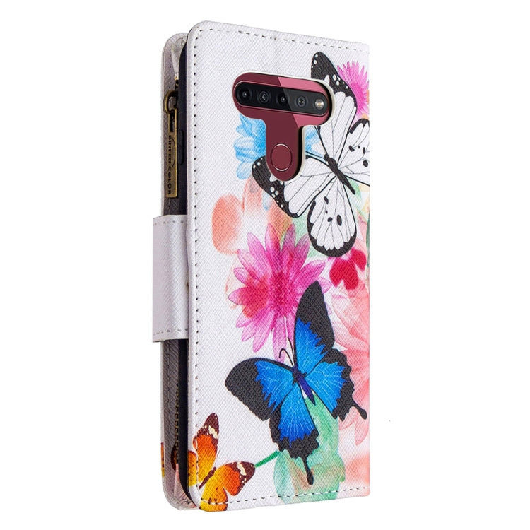 Estuche de Cuero Abatible Horizontal para LG K51 con Cremallera, Soporte, Ranuras para Tarjetas y Billetera (Dos Mariposas)