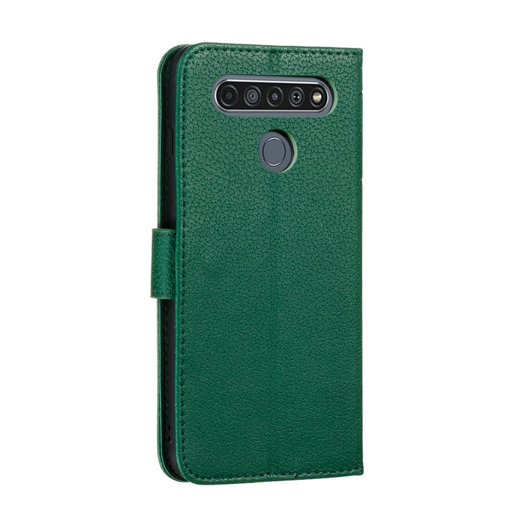 Estuche de Cuero para LG K61 con Tapa Horizontal, Textura Litchi, Diseño Plumas, Billetera y Soporte (Verde)