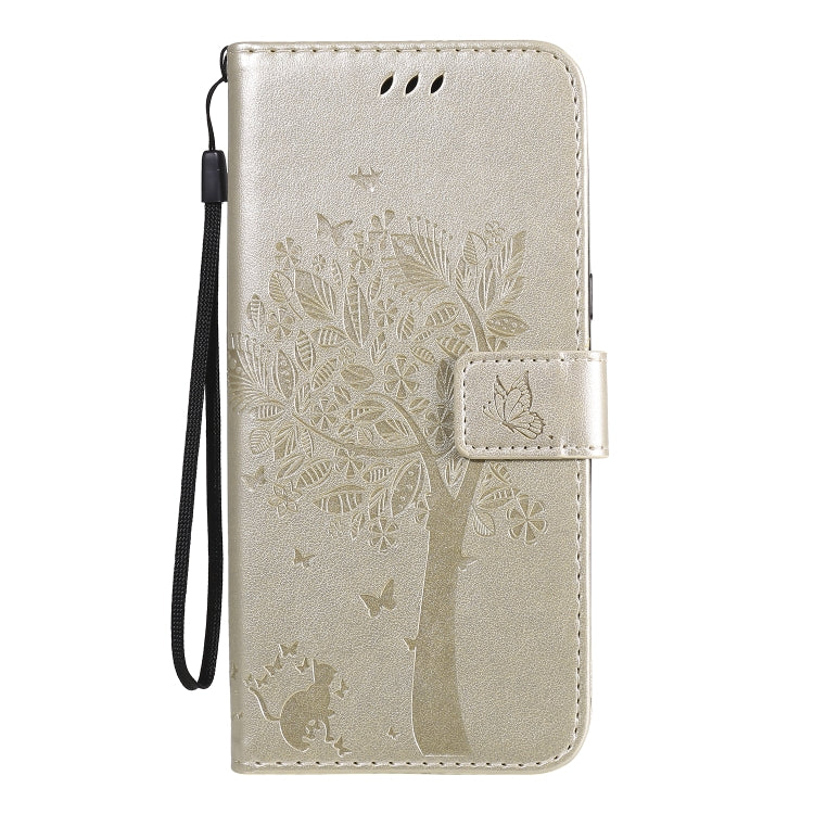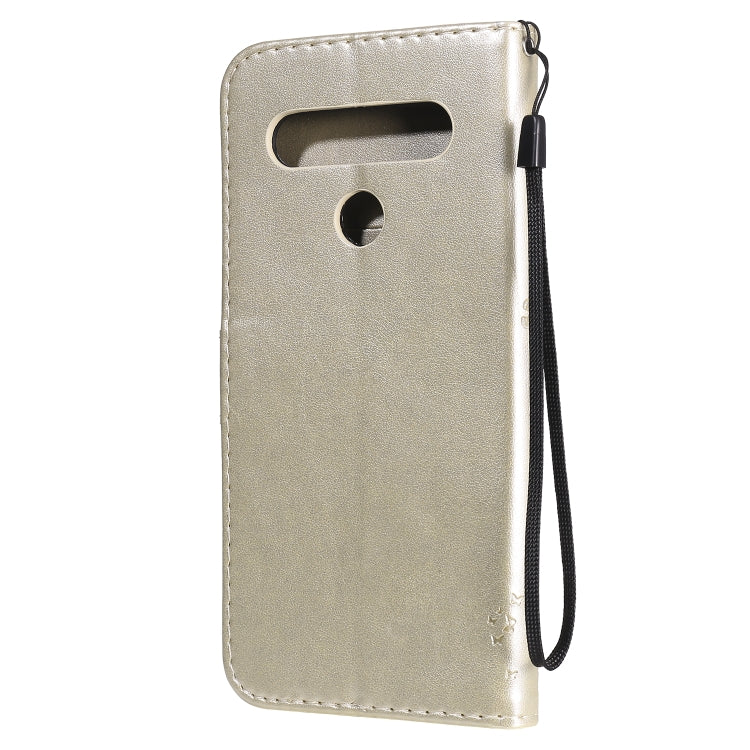 Funda de Cuero para LG K61 Tree & CAT con Tapa Horizontal, Soporte, Ranuras para Tarjetas, Billetera y Cordón (Dorado)