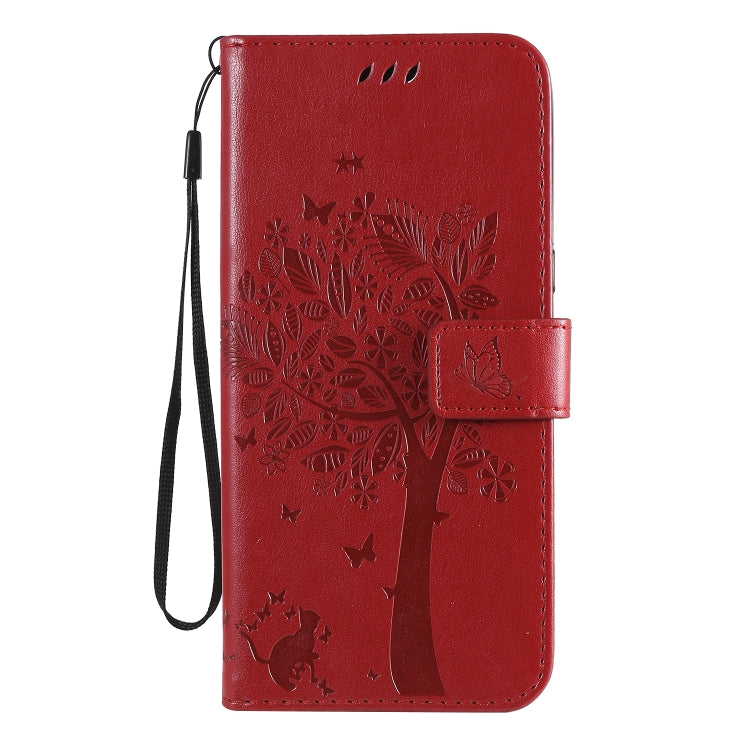 Funda de Cuero para LG K61 Tree & CAT con Tapa Horizontal, Soporte, Ranuras para Tarjetas, Billetera y Cordón (Rojo)