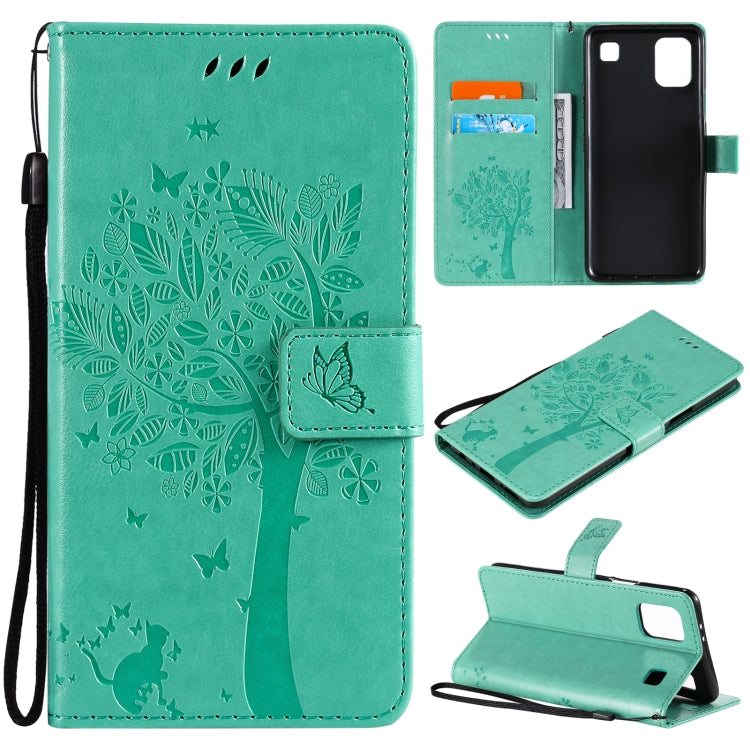 Funda Cuero PU LG K92 5G Árbol y Gato con Soporte, Ranuras y Cordón (Verde)