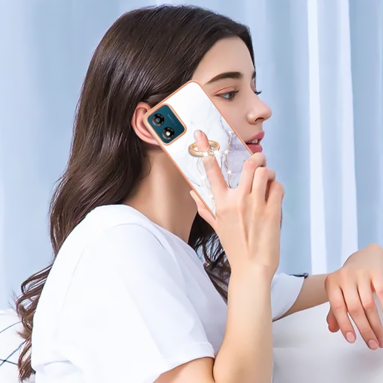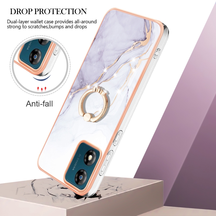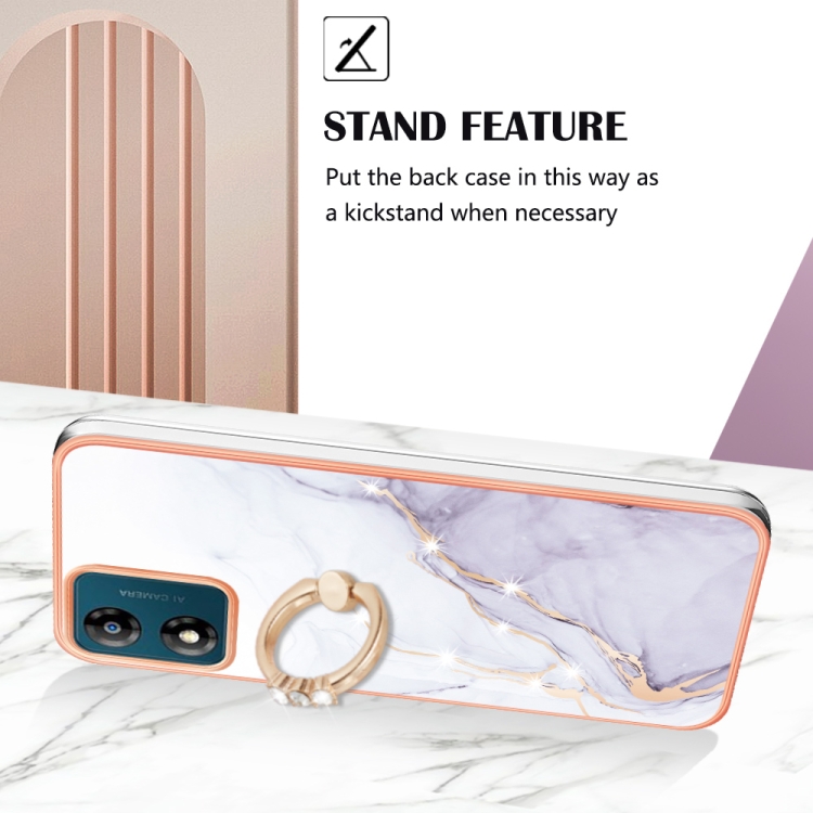 Funda TPU Motorola Moto E13 Galvanoplastia Mármol IMD con Soporte para Anillo (Blanco)
