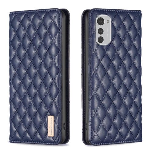 Funda Flip de Cuero Magnética para Motorola Moto E32 4G (Azul) con Diseño Diamond Lattice