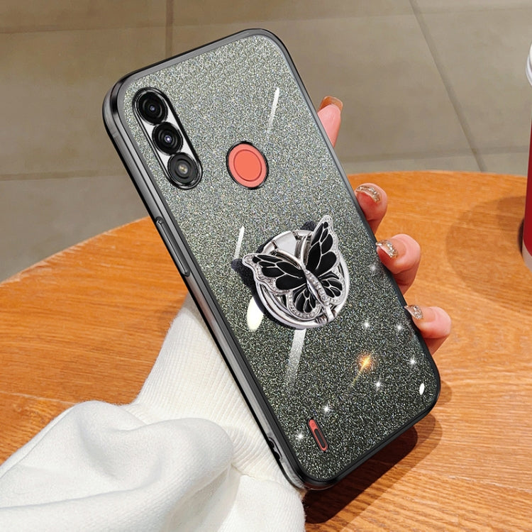 Estuche TPU para Motorola Moto E7 con Soporte de Mariposa y Brillo Degradado (Negro)
