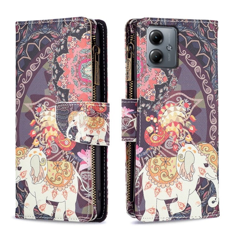 Funda de Cuero para Motorola Moto G14 4G con Cremallera y Dibujo Elefante de Flores