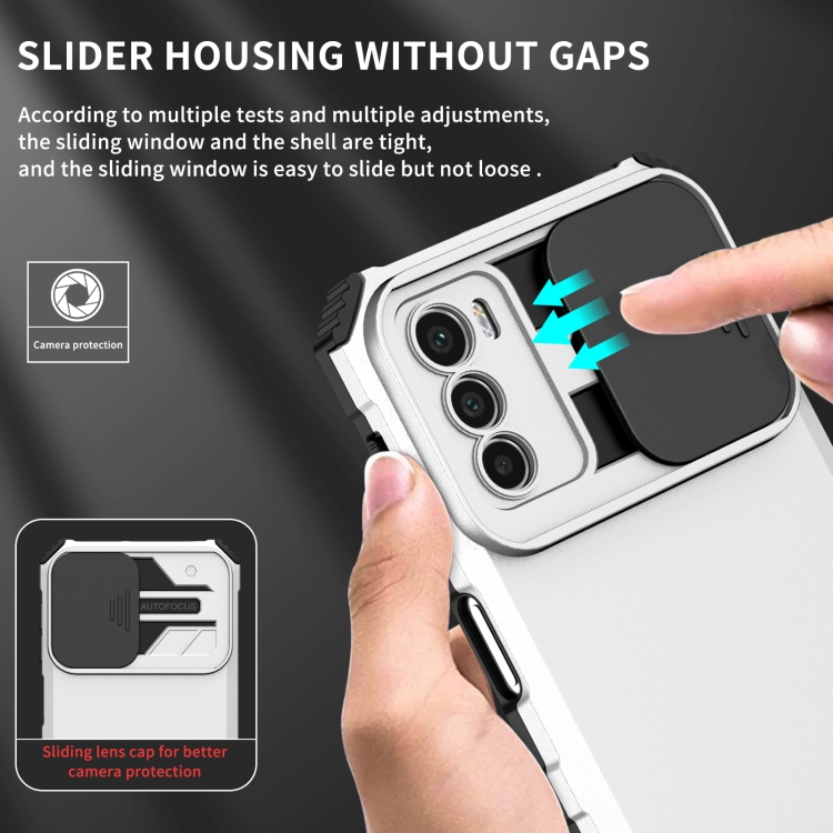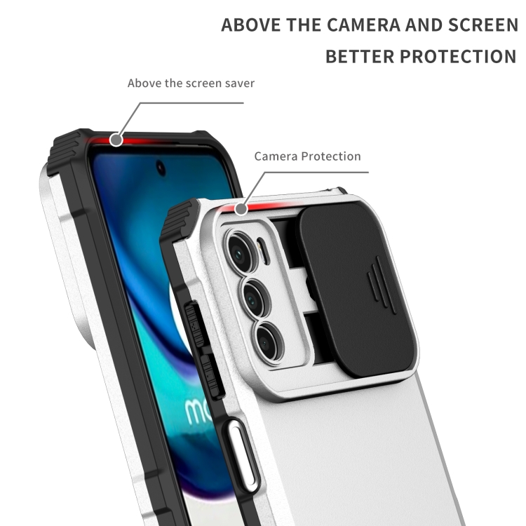 Funda para Motorola Moto G42 con Soporte Estereoscópico y Camshield Deslizante (Blanco)