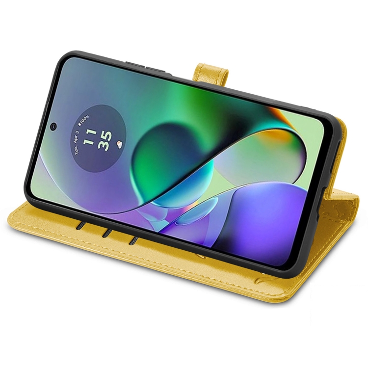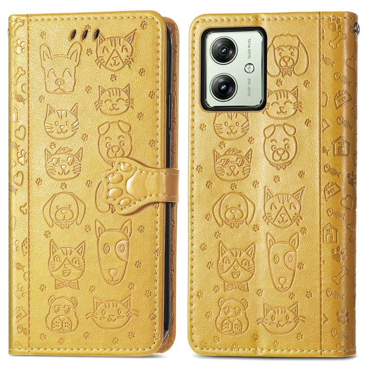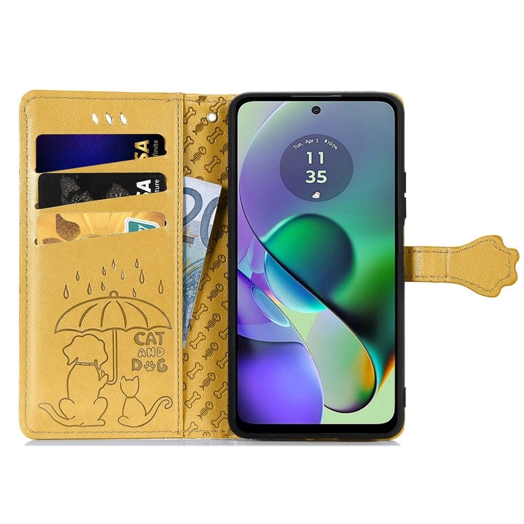 Funda para Motorola Moto G54 5G de Cuero con Relieve de Perro y Gato (Amarillo)