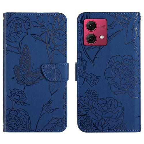 • 1x Funda de Cuero para Motorola Moto G84 HT03 Skin Feel Butterfly con Tapa en Relieve (Azul)