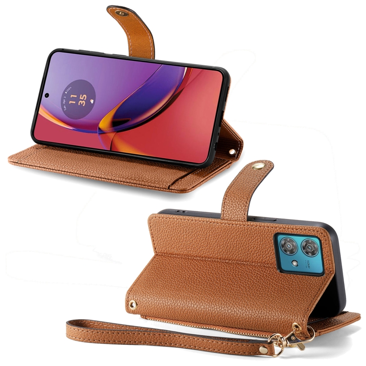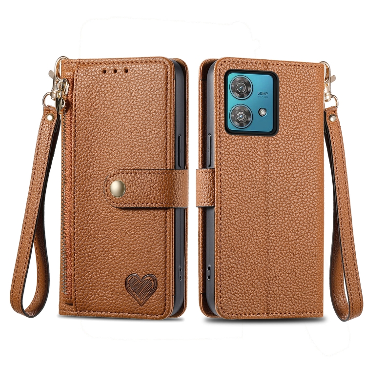 Funda de Cuero para Motorola Moto G84 Love Zipper con Lanyard (Marrón)