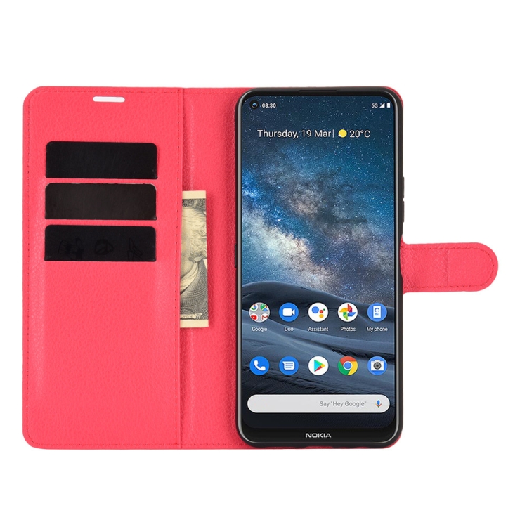 Para Nokia 8.3 5G Litchi Texture Funda protectora con tapa horizontal con soporte, ranuras para tarjetas y billetera (rojo)