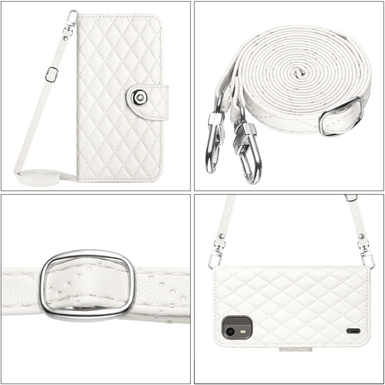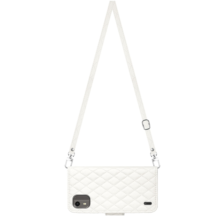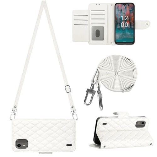 Funda de Cuero para Nokia C12 con Tapa Textura Rómbica y Cordón Largo (Blanco)