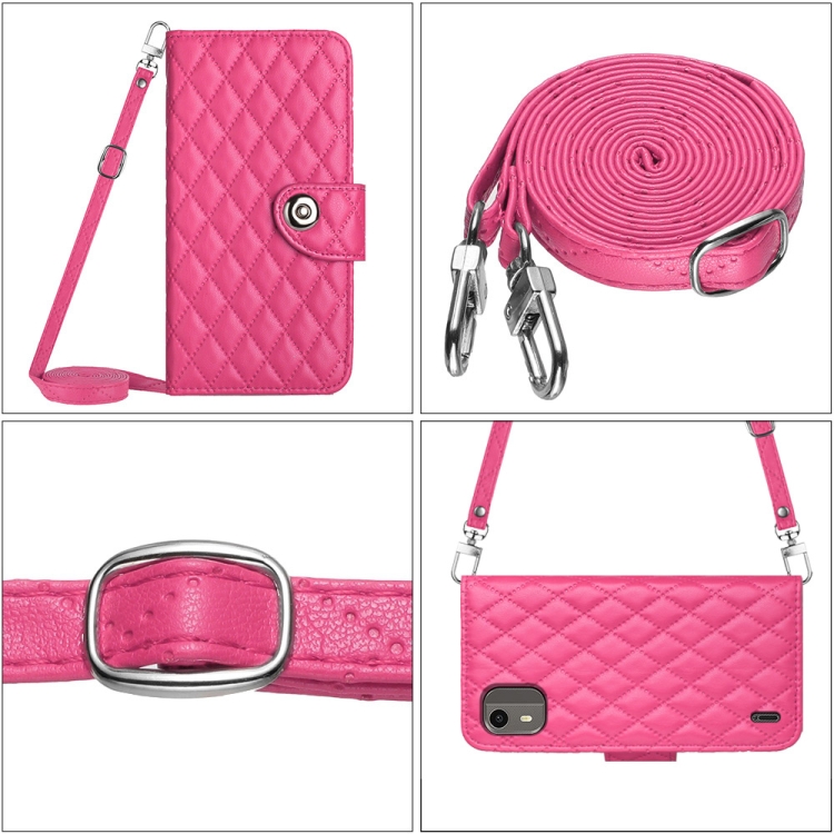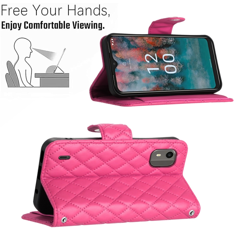 Funda de Cuero para Nokia C12 con Tapa Textura Rómbica y Cordón Largo (Rojo Rosa)