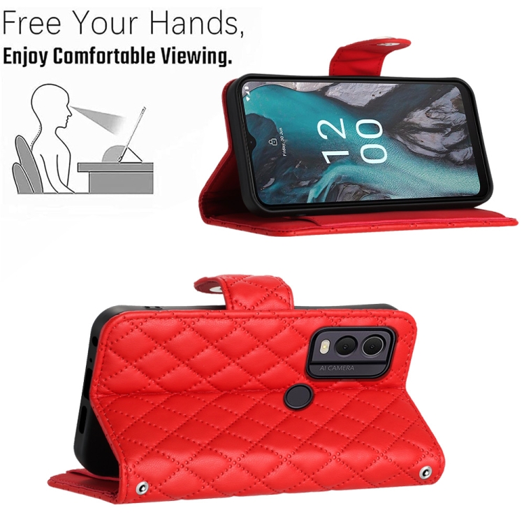 Funda de Cuero para Nokia C22 con Tapa Textura Rómbica y Cordón Largo (Rojo)