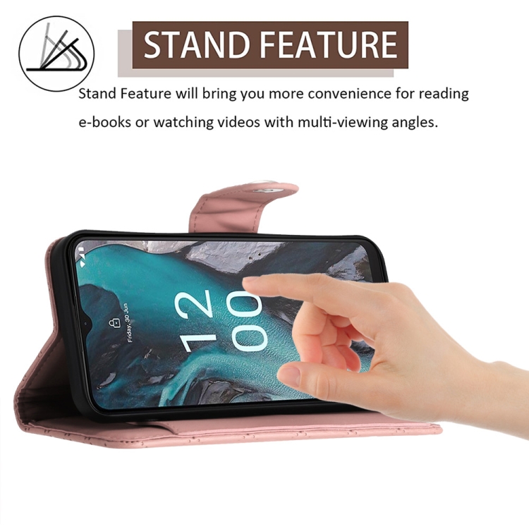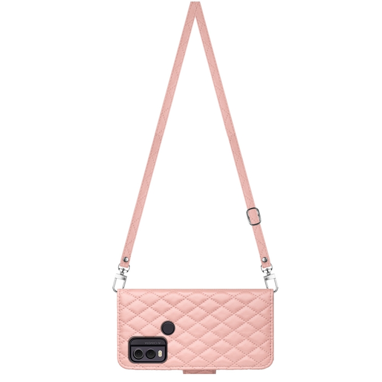 Funda de Cuero para Nokia C22 con Tapa, Textura Rómbica y Cordón Largo (Rosa Coral)