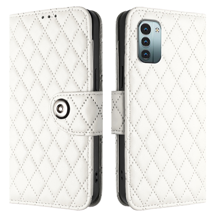 Funda para Nokia G11 / G21 con Tapa de Cuero, Textura Rómbica y Cordón (Blanco)