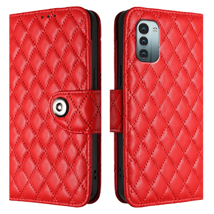 Funda para Teléfono Nokia G11 G21 con Tapa de Cuero Textura Rómbica y Cordón (Rojo)