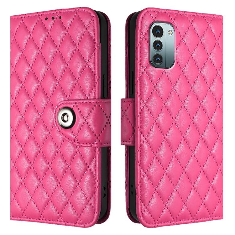 Funda para Nokia G11 / G21 de Cuero con Tapa Textura Rómbica y Cordón (Rojo Rosa)