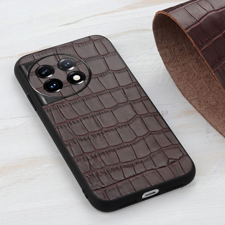 Funda de Cuero Genuino OnePlus 11 5G con Textura Cocodrilo y Orificio Preciso (Marrón)
