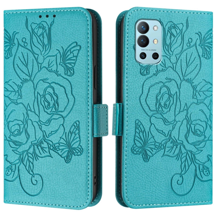 Funda de Cuero Antirrobo RFID para OnePlus 9R y 8T con Relieve Rosa (Azul Claro)