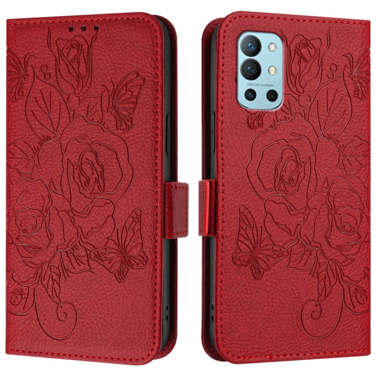 Funda de Cuero Antirrobo RFID para OnePlus 9R y 8T con Relieve Rosa (Rojo)