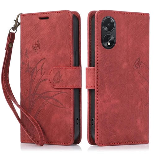Para Oppo A58 4G Orchid Butterfly Funda de Cuero para Teléfono En Relieve (Rojo)