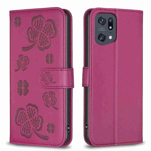 Para Oppo Find X5 Pro Funda de Cuero con Relieve de Cuatro Hojas para Teléfono (Rojo Rosa)