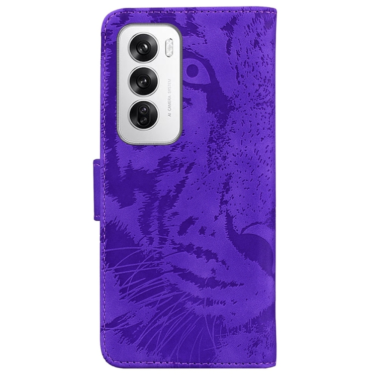 Para Oppo Reno12 5G Global Tiger Patrón En Relieve Funda de Cuero con Tapa para Teléfono (Púrpura)