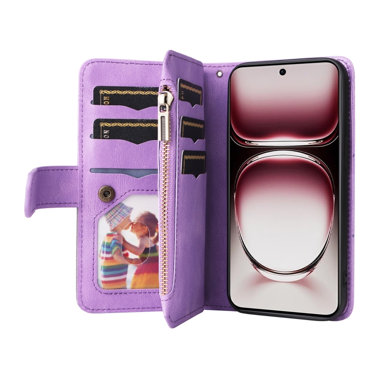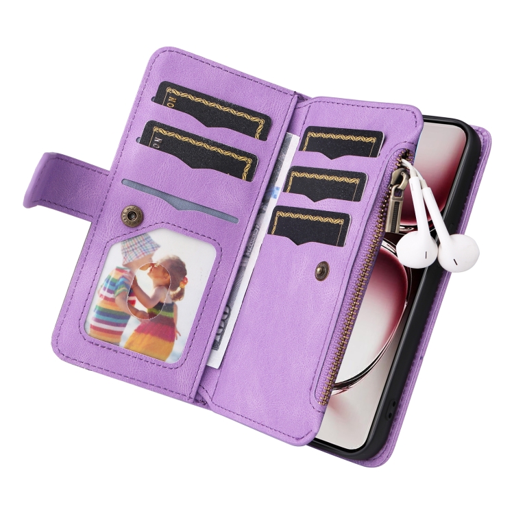 Para Oppo Reno12 Pro Global Dual-Color 9 Ranuras para Tarjetas Cartera con Cremallera Funda de Cuero para Teléfono (Púrpura)