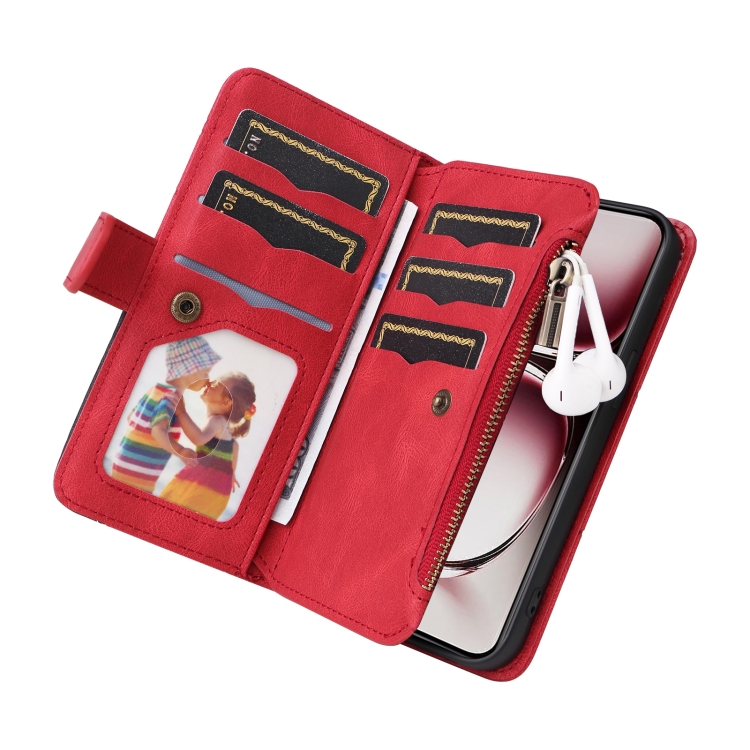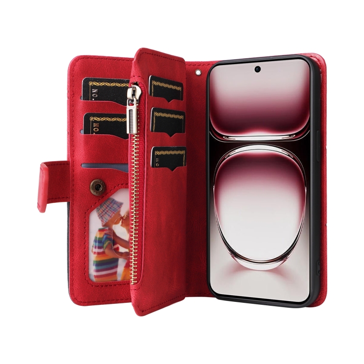 Para Oppo Reno12 Pro Global Dual-Color 9 Ranuras para Tarjetas Cartera con Cremallera Funda de Cuero para Teléfono (Rojo)