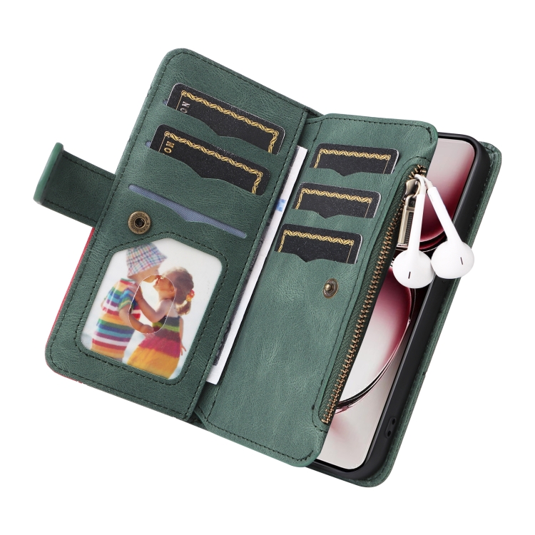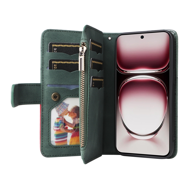 Para Oppo Reno12 Pro Global Dual-Color 9 Ranuras para Tarjetas Cartera con Cremallera Funda de Cuero para Teléfono (Verde)