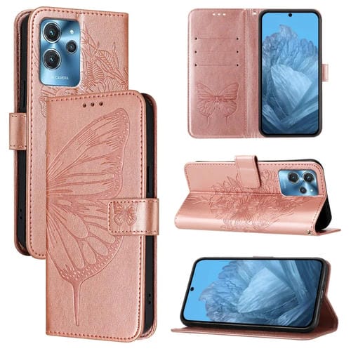 Funda de Cuero para Oukitel C32 con Mariposa en Relieve (Oro Rosa)