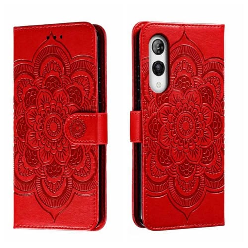 Funda de Cuero para Rakuten Hand 5G con Patrón en Relieve Sun Mandala (Rojo)