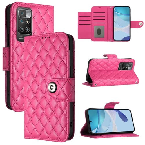 Para Redmi 10 / Redmi 10 2022 Funda para Teléfono de Cuero con Tapa con Textura Rómbica y Cordón (Rojo Rosa)