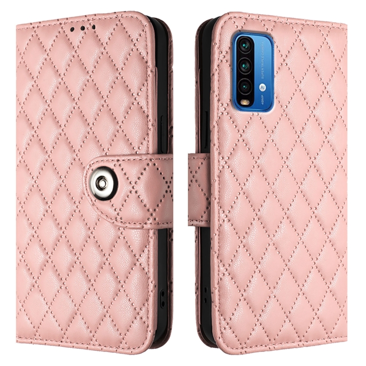 Para Redmi 9 Power / 9T Global Rhombic Texture Funda de Cuero con Tapa para Teléfono con Cordón (Rosa Coral)