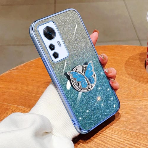Para Redmi K50 Funda para Teléfono de TPU con Soporte de Mariposa con Brillo Degradado Ultra Plateado (Azul Sierra)