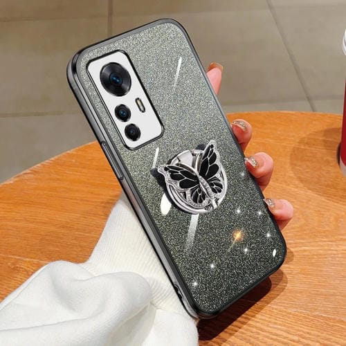 Para Redmi K50 Funda para Teléfono de TPU con Soporte de Mariposa con Brillo Degradado Ultra Plateado (Negro)