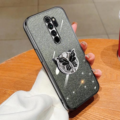 Para Redmi Note 8 Pro Funda para Teléfono de TPU con Soporte de Mariposa con Brillo Degradado Plateado (Negro)