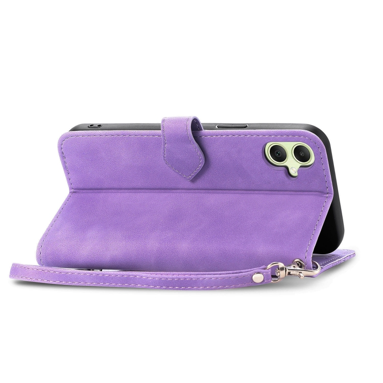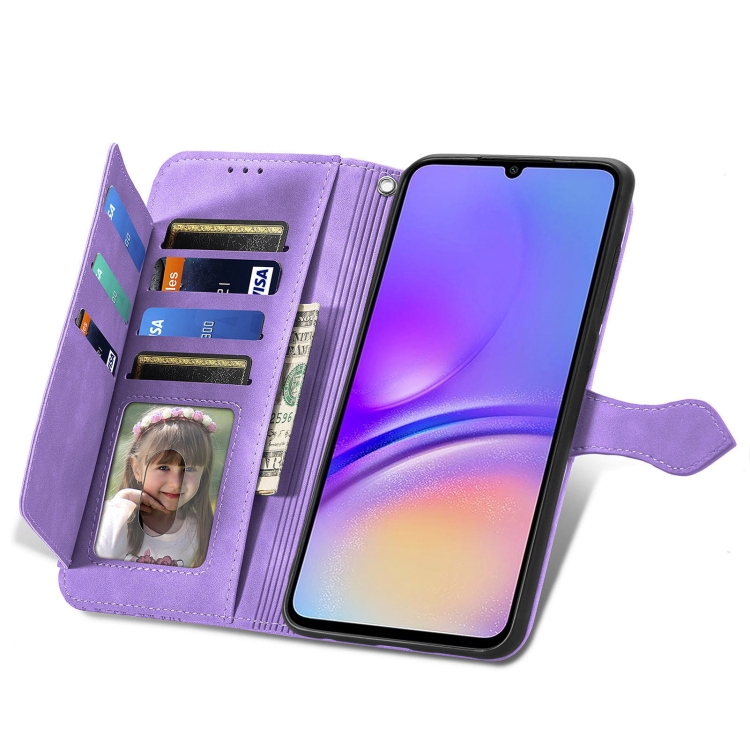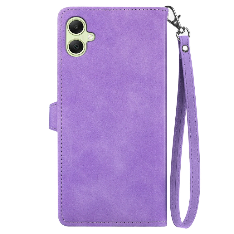 Funda de Cuero Samsung Galaxy A05 con Cremallera y Flores en Relieve (Púrpura)