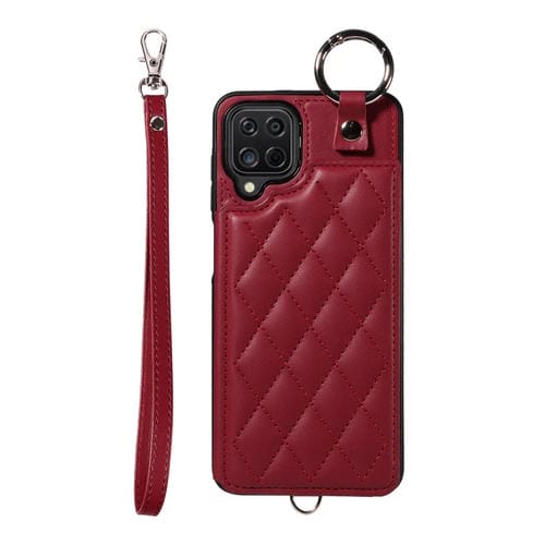 Estuche para Teléfono Samsung Galaxy A12 4G con Bolsa para Tarjetas Textura Rómbica y Cordón Corto (Rojo Vino)