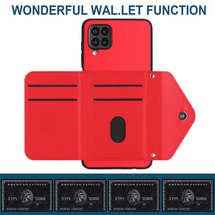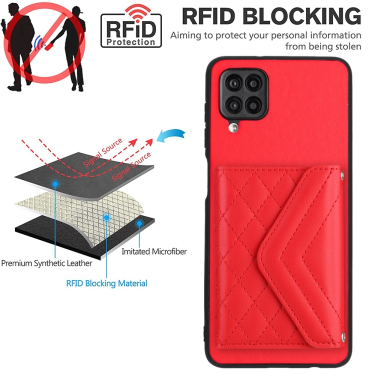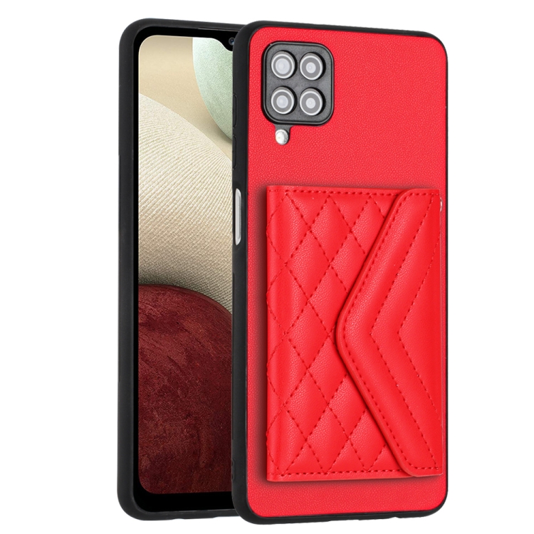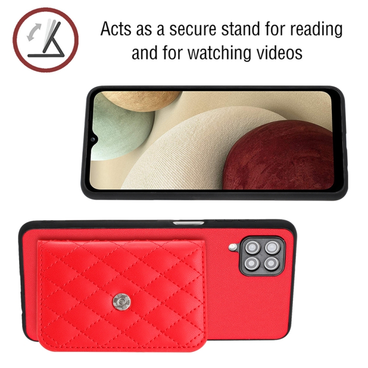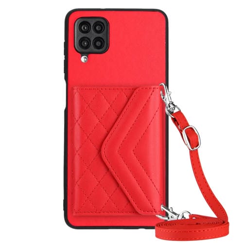 Estuche para Teléfono Samsung Galaxy A12 con Bolsa para Tarjetas Rfid Textura Rómbica y Cordón Largo (Rojo)