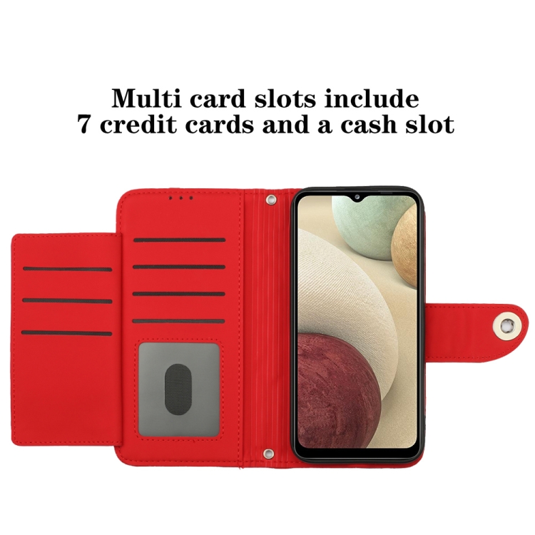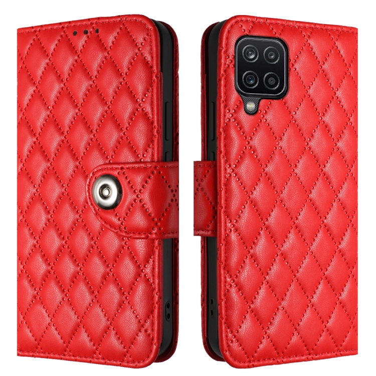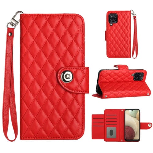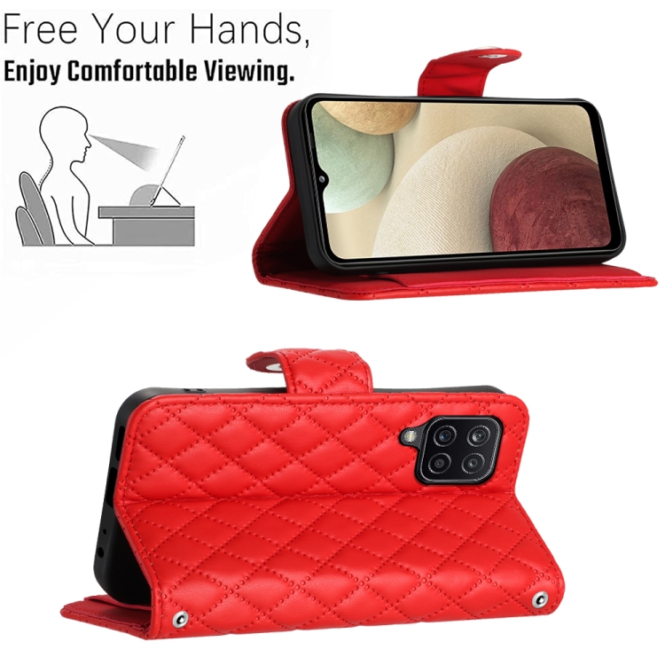 Funda para Teléfono Samsung Galaxy A12 / M12 con Tapa de Cuero Textura Rómbica y Cordón (Rojo)