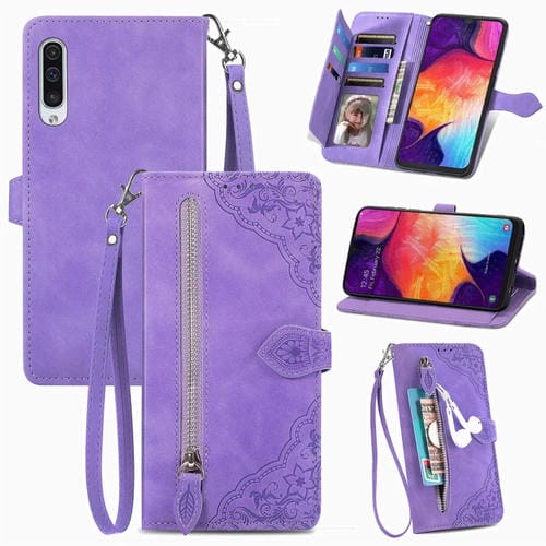 Funda de Cuero para Samsung Galaxy A15 con Cremallera y Flores en Relieve (Púrpura)