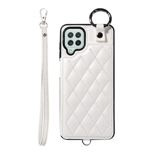 Estuche para Teléfono Samsung Galaxy A22 4G con Bolsa para Tarjetas Textura Rómbica y Cordón Corto (Blanco)