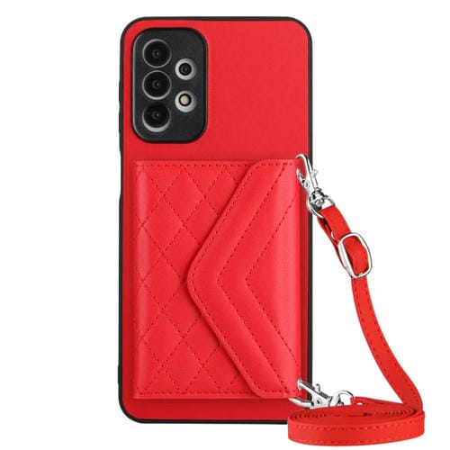 Estuche para Teléfono Samsung Galaxy A23 Rfid con Bolsa para Tarjetas Textura Rómbica y Cordón Largo (Rojo)