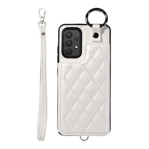 Estuche para Teléfono Samsung Galaxy A32 4G con Bolsa para Tarjetas Textura Rómbica y Cordón Corto (Blanco)