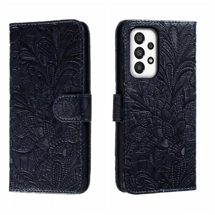 Para Samsung Galaxy A34 5G Lace Flower Relieve Funda de cuero con tapa para teléfono (Azul oscuro)