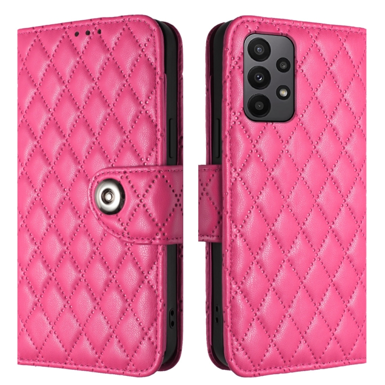 Funda para Teléfono Samsung Galaxy A52 4G y 5G con Tapa de Cuero Textura Rómbica y Cordón (Rojo Rosa)