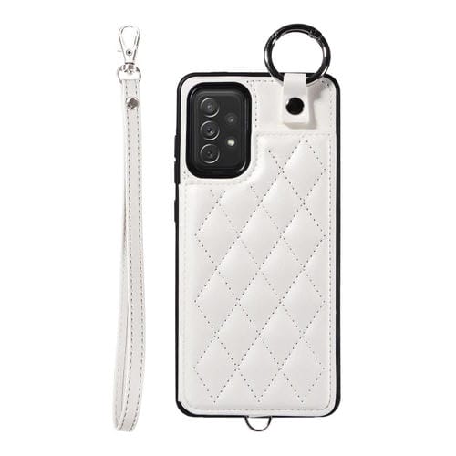 Estuche para Teléfono Samsung Galaxy A72 4G 5G con Bolsa para Tarjetas Textura Rómbica y Cordón Corto (Blanco)