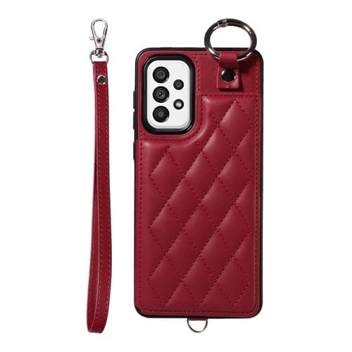 Estuche para Teléfono Samsung Galaxy A73 5G con Bolsa para Tarjetas Textura Rómbica y Cordón Corto (Rojo Vino)