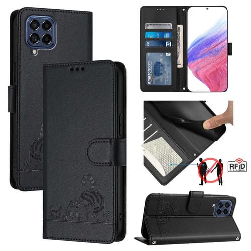 Estuche para teléfono Samsung Galaxy M53 5G Cuero Rfid patrón en relieve y cordón (Negro)